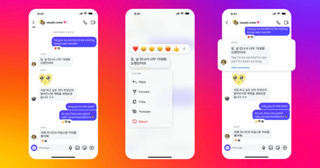 If someone sends you a message in another language, Instagram can translate it for you without leaving the app. Instagram supports translation in 99 languages, powered by Meta’s translation technology.