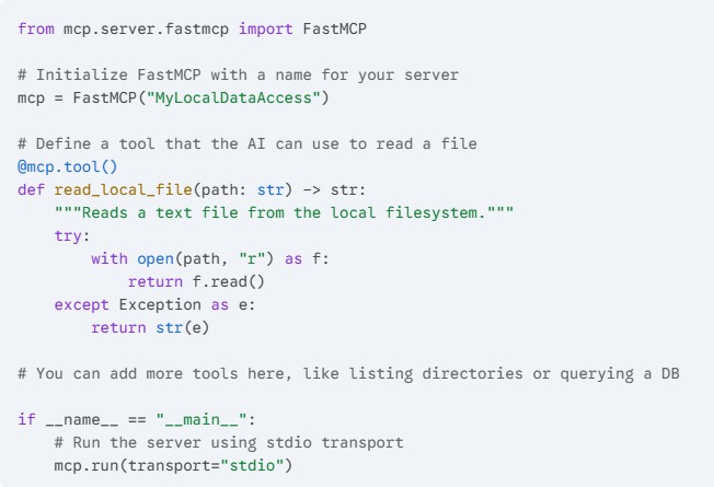 This simple script sets up an MCP server named “MyLocalDataAccess” and creates a single tool (read_local_file) that your AI assistant can call to read text files on your machine. The mcp.run(transport="stdio") line is crucial, as it tells the server to communicate using standard input/output, which is how many AI assistant clients interact with local servers.
